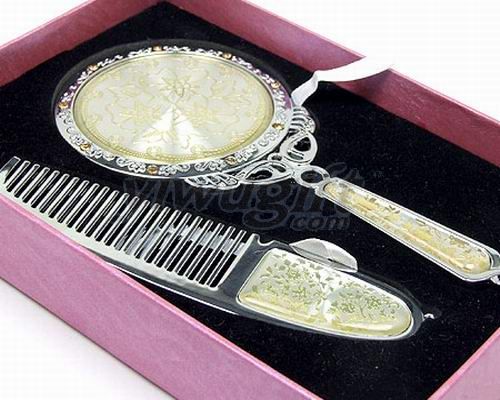 金属材质,镜子尺寸:14.8*6.9*0.5cm,梳子12.3*3*0.3cm,盒子11.6*17*3cm。